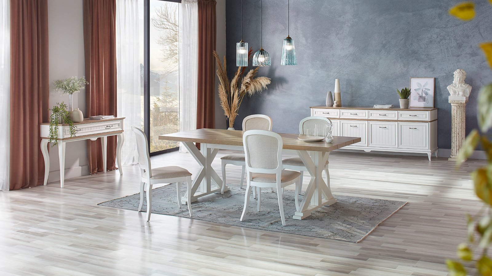 The elegance of the country style in your dining room ‘Angelic’, reflecting the ‘Country’ style with its peaceful natural tones and an unpretentious, elegant design, carries the traces of the past to the present. Your dining rooms will make a difference with their different table design and stylish chairs.