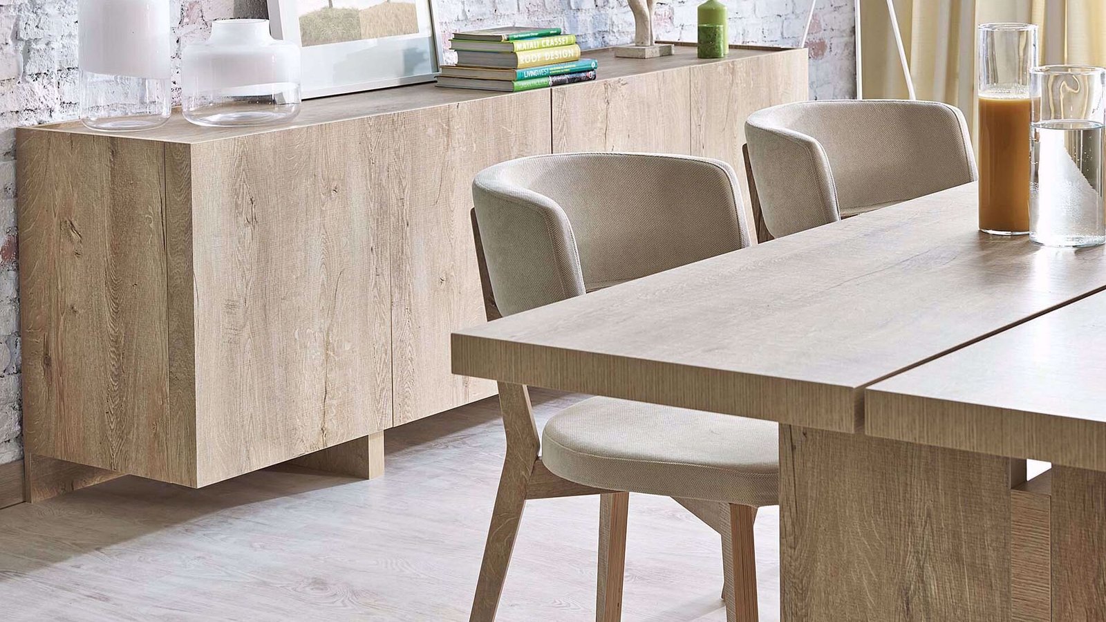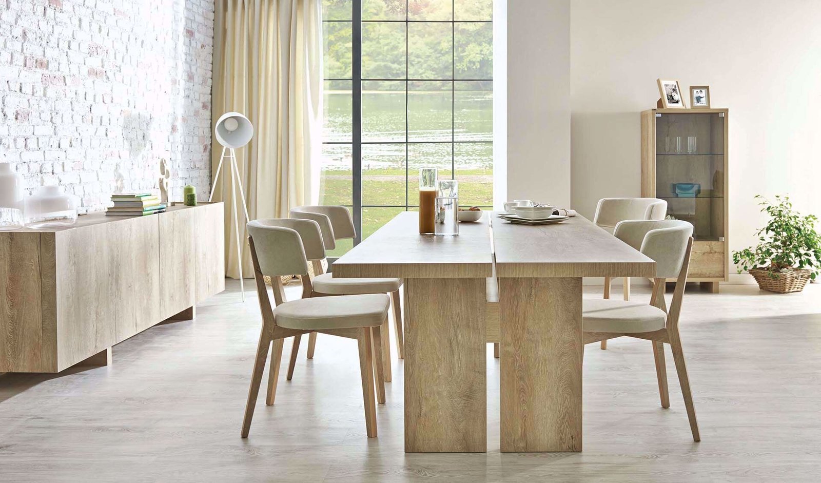 A dining room that suits the stars. The combination of plain designs with no handle and the natural color of oak and the metallic tones of coffee. The handy two-piece table top and durable chairs are the stars of the team.